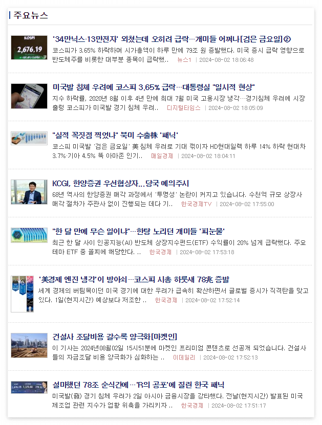 주요뉴스를 보니 악재가 가득합니다. 미국발 경기 침체 우려라고는 하지만, K-주식만큼 온갖 악재는 선 반영하고 호재도 악재에 가려서 반영이 안되는 시장이 또 있을까 싶기도 합니다. 그냥 추세 추종으로 투자하는 나 같은 투자자는 뉴스는 거들 뿐 투자에 기준이 전혀 되지 못합니다. 그냥 오르면 사고, 떨어지면 팔 뿐. 그 이상도 그 이하도 아닙니다. 오늘도 몇 종목은 손절이 되었고, 또 몇종목은 추가 매수가 되었습니다. 전반적인 계좌는 당연히 손실입니다.