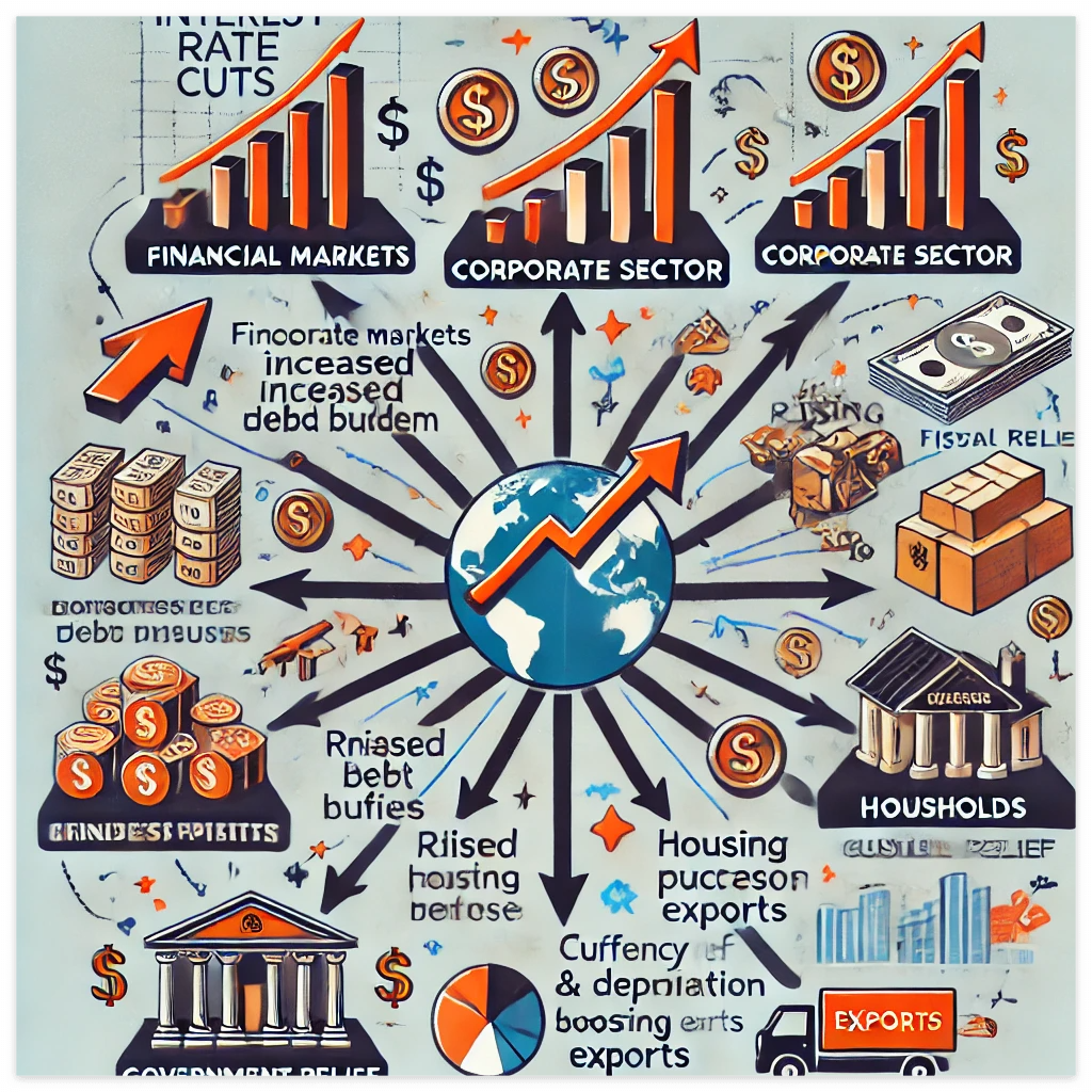 - 금리 인하는 금융 시장, 기업, 가계, 자산 시장, 정부 정책 등에 광범위하게 영향을 미치는 중요한 정책 도구이다. 금리 인하로 인한 경기 부양 효과는 경제 전반에 긍정적인 영향을 미칠 수 있지만, 장기적으로는 자산 거품, 인플레이션, 부채 문제와 같은 부작용도 동반될 수 있다. 따라서 금리 인하는 각국 중앙은행이 신중하게 운용해야 하는 정책 수단이다.
